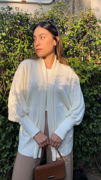 Cardigã Débora, em tecido 100% acrílico, uma fibra sintética conhecida por sua durabilidade, resistência a rugas e facilidade de manutenção. Ele imita o toque da lã e do algodão, mas é mais leve e oferece bom isolamento térmico. Tamanho Único, veste até 46/48.