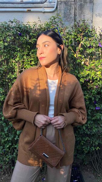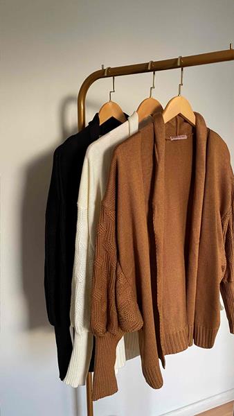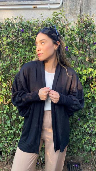 Cardigã Débora, em tecido 100% acrílico, uma fibra sintética conhecida por sua durabilidade, resistência a rugas e facilidade de manutenção. Ele imita o toque da lã e do algodão, mas é mais leve e oferece bom isolamento térmico. Tamanho Único, veste até 46/48.